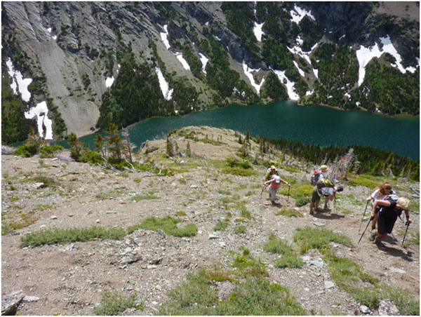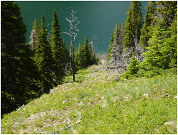 Once at the lake, you hike on the right side towards the campsite on the north shore of the lake. There is no single way up to Bertha Peak from here. One of the more common ways is to find the ridge approximately one-third of the way around the Lake. There is a meadow where you can see an outcropped ridge that ascends north (see Pictures 1 and 2 for a look at the ridge, a few minutes up from the trail. |