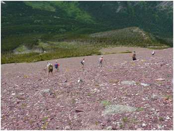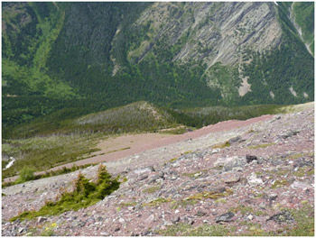 ![]() The trick to going down on to the Alderson Trail is to find the avalanche chute by going far more west towards Alderson Lake and then dropping down. You will see from Pictures to the right that we took the red rock slope down to the avalanche and then followed the creek on to the Alderson Trail. |