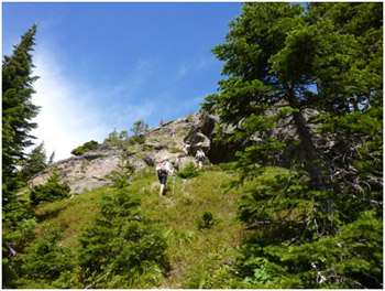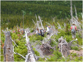 ![]() The bushwhacking is difficult for 30-45 minutes (as pictured above). In the avalanche chute we ran into a little black bear. Once we hit the Alderson Trail we went out to the townsite. The entire trip took us 9 ½ hours, with a long lunch at Bertha Peak. Keep on hiking. Lockey. |