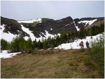 ![]() The top of the ridge leads to a beautiful Tamarak (Western Larch) bowl. |