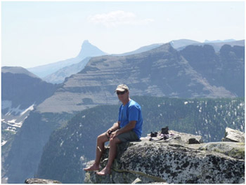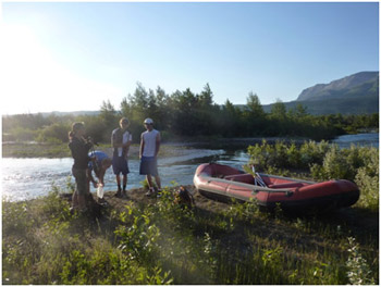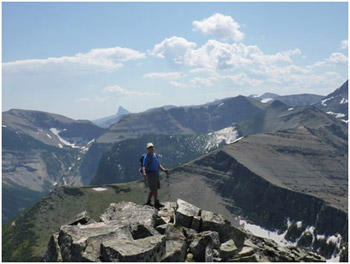 July 9, 2012 was a hot day for Southern Alberta, particularly in Waterton Lakes, at the townsite, approximately 4,200 feet above sea level and the peaks near 10,000 feet above sea level. The temperature was 31 degrees Celsius (88 Fahrenheit). We started another great adventure. This trip was to summit Vimy Peak across Waterton Lakes from the townsite, walk along the ridge, descend on to the Crypt Lake Trail right before the tunnel, visit Crypt and come home on the Crypt Lake Trail. The logistics as a result of the lake make this trip a little difficult. We rafted over through the river between the middle and lower lake and picked up with Wishbone Trail. Normally you pick up the trail at Marquis Hole but Marquis Hole was closed due to a bear in the area. We ended up having to paddle down the river to the head of the lower lake where we were able to easily pick up the trail. (Added 1.5 kilometers (1 mile) approximately to our trip.) We would catch the Shoreline Cruises boat home. I had the opportunity to visit with Rod Kretz the owner of Shoreline Cruises on the way home. |