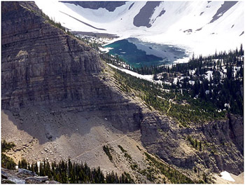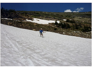 ![]() The only tricky part of the entire trip is to make sure that you descend off the ridge into the bowl before the Crypt Lake bowl and no sooner. The best gauge is to ensure that you have passed the trail which is very visible into Crypt Lake tunnel prior to your descent. You cannot descend either before or after that. |